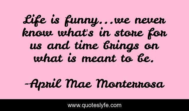 This page presents the quote "Life is funny...we never know what's in store for us and time brings on what is meant to be.". Author of this quote is April Mae Monterrosa. This quote is about time-passing, meant-to-be, life-and-sayings,.