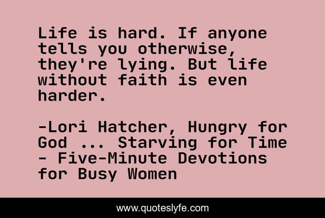 This page presents the quote "Life is hard. If anyone tells you otherwise, they're lying. But life without faith is even harder.". Author of this quote is Lori Hatcher, Hungry for God ... Starving for Time - Five-Minute Devotions for Busy Women. This quote is about christian-living, devotional,.