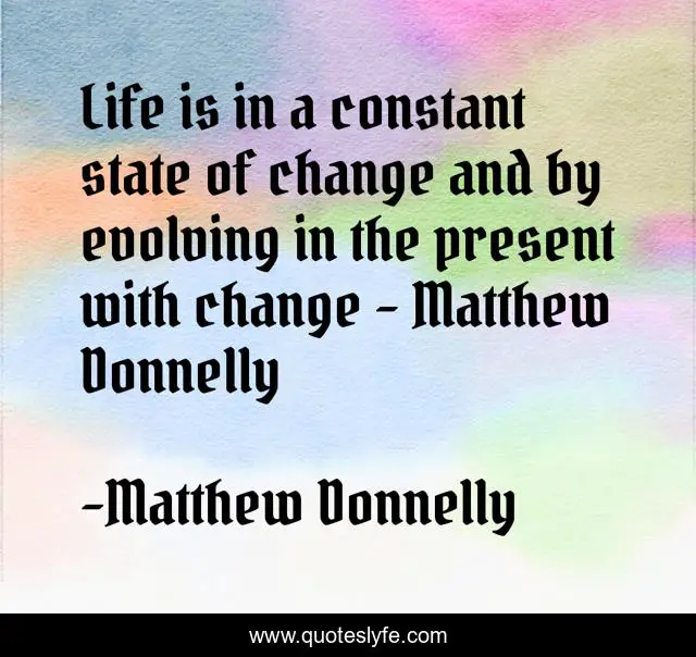 This page presents the quote "Life is in a constant state of change and by evolving in the present with change - Matthew Donnelly". Author of this quote is Matthew Donnelly. This quote is about confidence, personal-growth, positive, motivational, self-improvement, inspirational, self-help, personal-development, enthusiasm,.