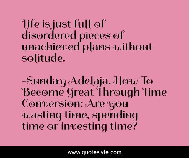 This page presents the quote "Life is just full of disordered pieces of unachieved plans without solitude.". Author of this quote is Sunday Adelaja, How To Become Great Through Time Conversion: Are you wasting time, spending time or investing time?. This quote is about solitude, life, conversion, unachievements, productivity, wealth, greatness, waste, humanity,.