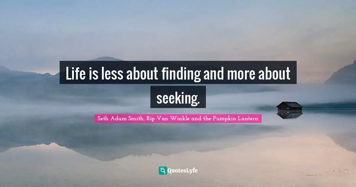 This page presents the quote "Life is less about finding and more about seeking.". Author of this quote is Seth Adam Smith, Rip Van Winkle and the Pumpkin Lantern. This quote is about life, seeking, searching, more-about-seeking, finding, meaning-of-life, wandering,.
