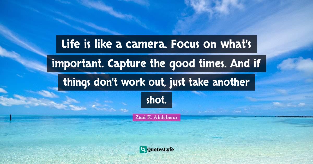 This page presents the quote "Life is like a camera. Focus on what's important. Capture the good times. And if things don't work out, just take another shot.". Author of this quote is Ziad K. Abdelnour. This quote is about good times, life is like, work out, life, encouraging, capture, focus, what's important, uplifting,.