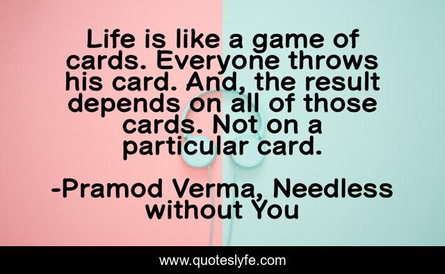 This page presents the quote "Life is like a game of cards. Everyone throws his card. And, the result depends on all of those cards. Not on a particular card.". Author of this quote is Pramod Verma, Needless without You. .