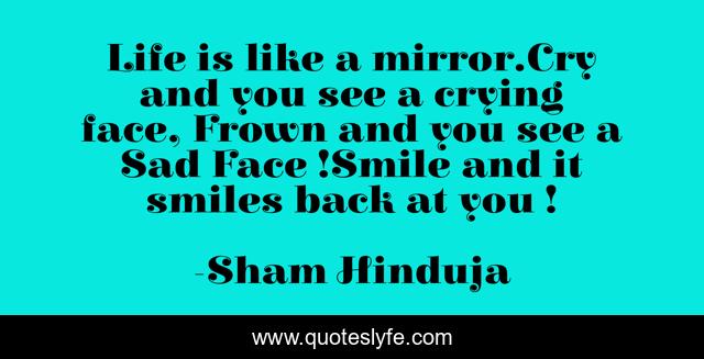 This page presents the quote "Life is like a mirror.Cry and you see a crying face, Frown and you see a Sad Face !Smile and it smiles back at you !". Author of this quote is Sham Hinduja. This quote is about smile, life-and-living, happiness, sad,.