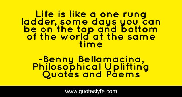This page presents the quote "Life is like a one rung ladder, some days you can be on the top and bottom of the world at the same time". Author of this quote is Benny Bellamacina, Philosophical Uplifting Quotes and Poems. This quote is about life, humor, humour, philosophy, wisdom, philosophical,.
