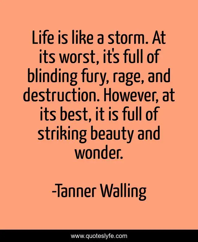 This page presents the quote "Life is like a storm. At its worst, it's full of blinding fury, rage, and destruction. However, at its best, it is full of striking beauty and wonder.". Author of this quote is Tanner Walling. This quote is about life, motivational-inspirational, storms, motivation, weather, storms-of-life, inspiration,.
