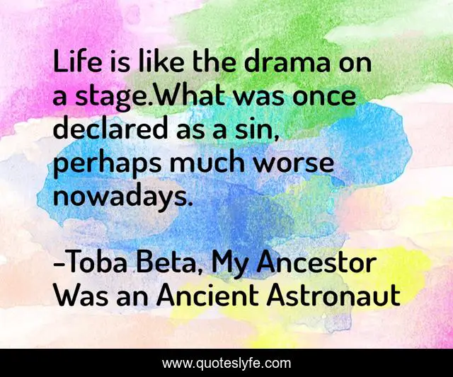 This page presents the quote "Life is like the drama on a stage.What was once declared as a sin, perhaps much worse nowadays.". Author of this quote is Toba Beta, My Ancestor Was an Ancient Astronaut. This quote is about drama, live, sin, worse,.