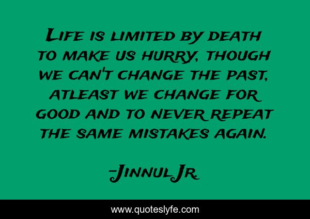 This page presents the quote "Life is limited by death to make us hurry, though we can't change the past, atleast we change for good and to never repeat the same mistakes again.". Author of this quote is Jinnul Jr.. This quote is about mistakes, life, death, flaws, past, future, change, goodness, time,.