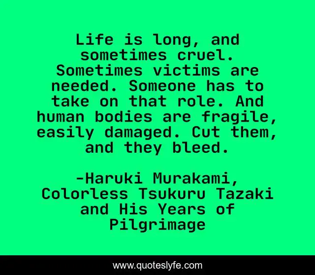 This page presents the quote "Life is long, and sometimes cruel. Sometimes victims are needed. Someone has to take on that role. And human bodies are fragile, easily damaged. Cut them, and they bleed.". Author of this quote is Haruki Murakami, Colorless Tsukuru Tazaki and His Years of Pilgrimage. .