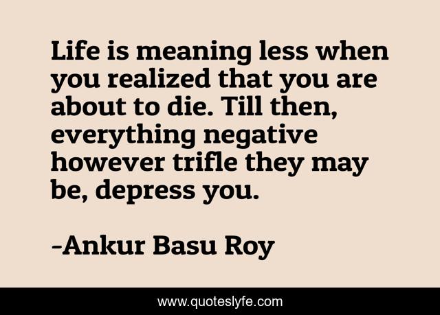 This page presents the quote "Life is meaning less when you realized that you are about to die. Till then, everything negative however trifle they may be, depress you.". Author of this quote is Ankur Basu Roy. This quote is about life-and-living, life-philosophy, wit, humor, witty,.