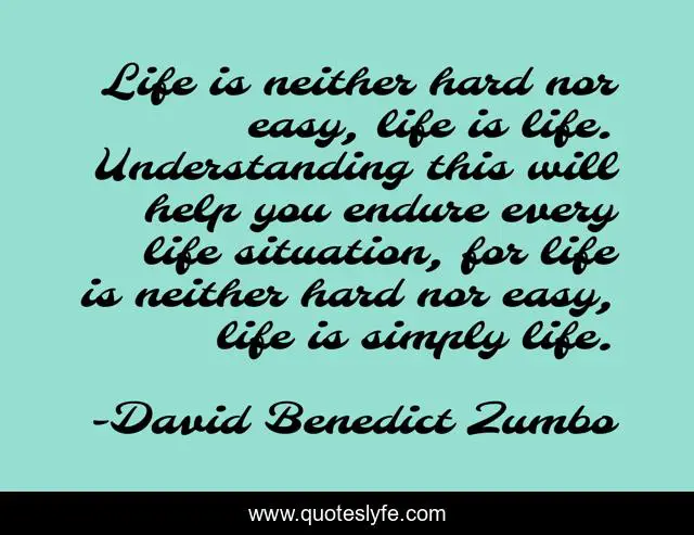 This page presents the quote "Life is neither hard nor easy, life is life. Understanding this will help you endure every life situation, for life is neither hard nor easy, life is simply life.". Author of this quote is David Benedict Zumbo. This quote is about inspirational-attitude, truth-of-life, hardships-in-life, life-lessons, wisdom,.