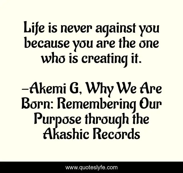 "Akemi G, Why We Are Born: Remembering Our Purpose through the Akashic Records Quotes." Quoteslyfe.com, 2025. Fri. 05 Dec. 2025. <https://www.quoteslyfe.com/quote/Life-is-never-against-you-because-you-216075>.