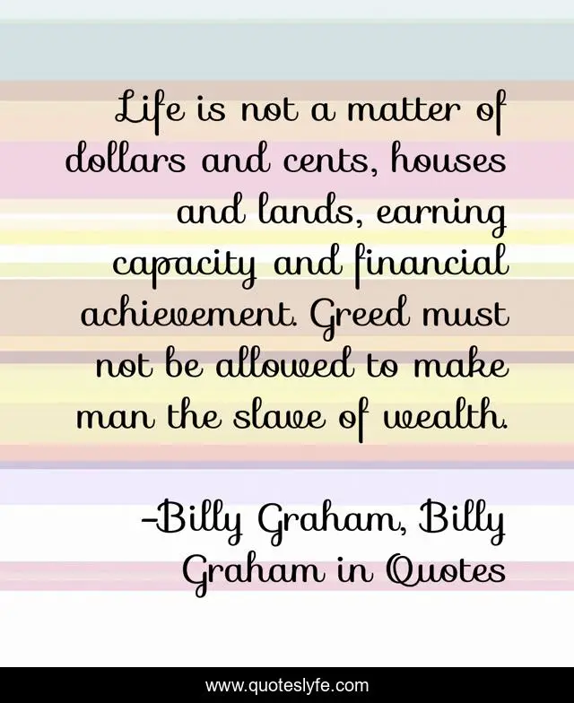 This page presents the quote "Life is not a matter of dollars and cents, houses and lands, earning capacity and financial achievement. Greed must not be allowed to make man the slave of wealth.". Author of this quote is Billy Graham, Billy Graham in Quotes. This quote is about greed, billy-graham,.