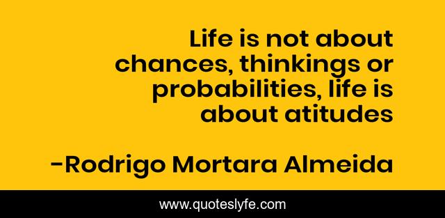 This page presents the quote "Life is not about chances, thinkings or probabilities, life is about atitudes". Author of this quote is Rodrigo Mortara Almeida. This quote is about inspirational-attitude, inspirational-life, inspirational, enthusiasm,.