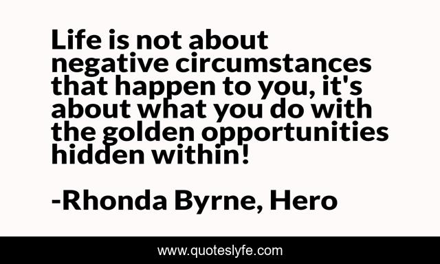 This page presents the quote "Life is not about negative circumstances that happen to you, it's about what you do with the golden opportunities hidden within!". Author of this quote is Rhonda Byrne, Hero. This quote is about life, hero, rhonda-byrne, quote, philosophy, opportunities, wisdom, quotes, inspirational,.