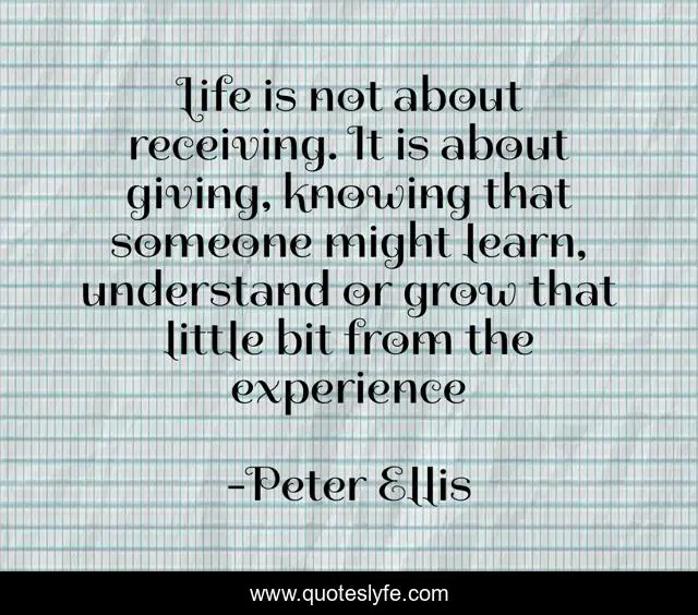 This page presents the quote "Life is not about receiving. It is about giving, knowing that someone might learn, understand or grow that little bit from the experience". Author of this quote is Peter Ellis. This quote is about helpful, business, success-self-improvement, success, success-in-life, success-in-business, inspirational, enthusiasm, hope,.