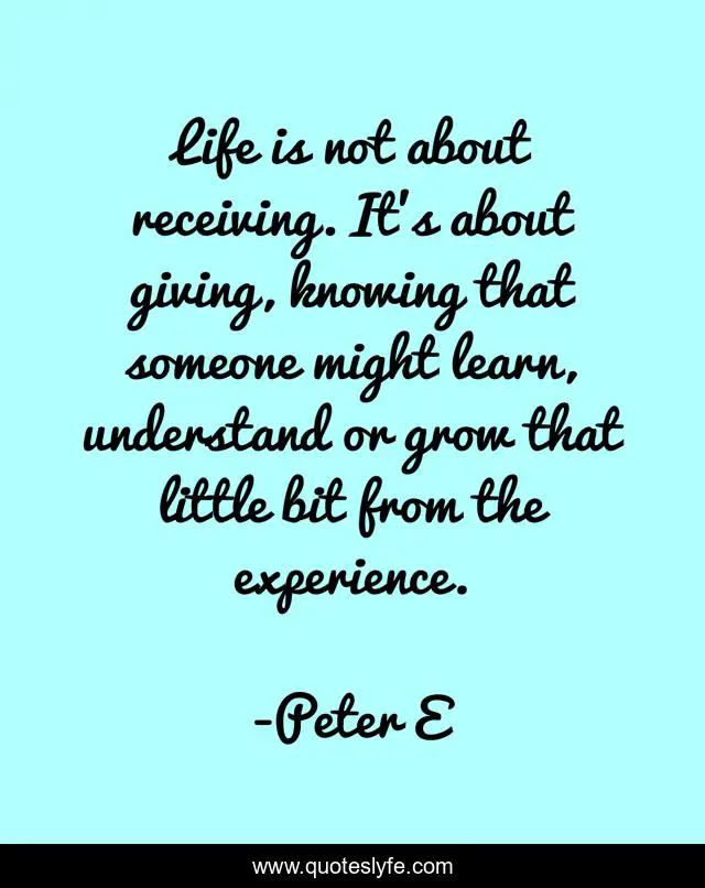 This page presents the quote "Life is not about receiving. It's about giving, knowing that someone might learn, understand or grow that little bit from the experience.". Author of this quote is Peter E. This quote is about helping-others, business, success, inspiration,.