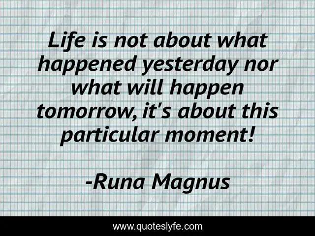 This page presents the quote "Life is not about what happened yesterday nor what will happen tomorrow, it's about this particular moment!". Author of this quote is Runa Magnus. This quote is about inspirational, mindfulness, life-changing, life-lessons, life-philosophy, enthusiasm, happiness, mindset,.