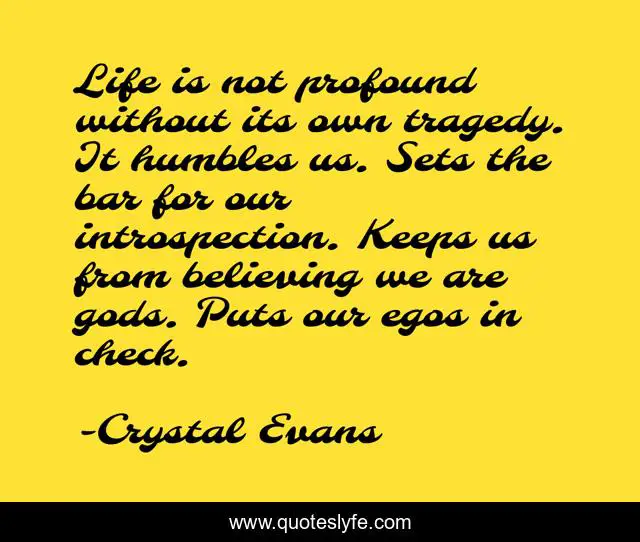 This page presents the quote "Life is not profound without its own tragedy. It humbles us. Sets the bar for our introspection. Keeps us from believing we are gods. Puts our egos in check.". Author of this quote is Crystal Evans. This quote is about life-philosophy, death-and-dying, death-of-a-loved-one,.