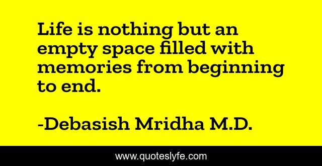 This page presents the quote "Life is nothing but an empty space filled with memories from beginning to end.". Author of this quote is Debasish Mridha M.D.. This quote is about life, beginning-to-end, memories, philosophy, debasish-mridha, quotes, empty-space, inspirational, enthusiasm,.