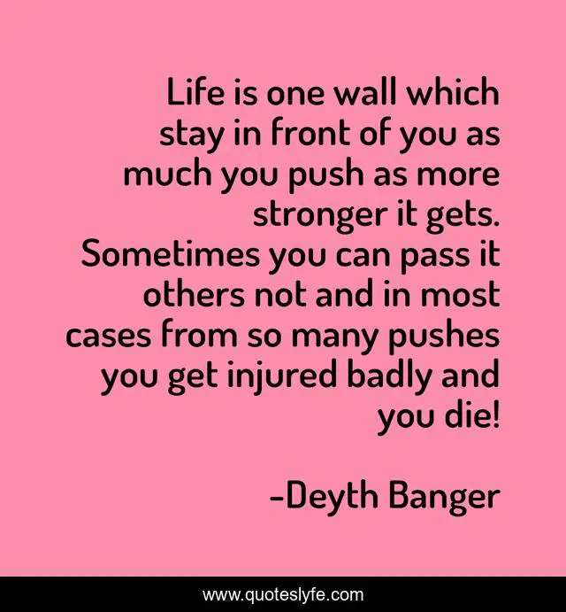This page presents the quote "Life is one wall which stay in front of you as much you push as more stronger it gets. Sometimes you can pass it others not and in most cases from so many pushes you get injured badly and you die!". Author of this quote is Deyth Banger. This quote is about injured, badly, life, wall, die, wood, pass,.