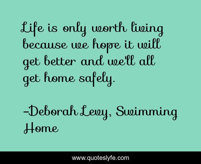 This page presents the quote "Life is only worth living because we hope it will get better and we'll all get home safely.". Author of this quote is Deborah Levy, Swimming Home. This quote is about life, point, past, meaning, future, home,.