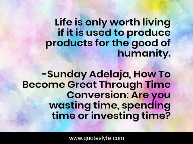 This page presents the quote "Life is only worth living if it is used to produce products for the good of humanity.". Author of this quote is Sunday Adelaja, How To Become Great Through Time Conversion: Are you wasting time, spending time or investing time?. This quote is about humanity, convert, productivity, wealth, gift, work, life, great, value,.