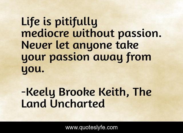This page presents the quote "Life is pitifully mediocre without passion. Never let anyone take your passion away from you.". Author of this quote is Keely Brooke Keith, The Land Uncharted. .