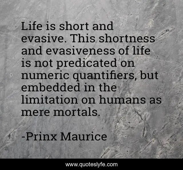 This page presents the quote "Life is short and evasive. This shortness and evasiveness of life is not predicated on numeric quantifiers, but embedded in the limitation on humans as mere mortals.". Author of this quote is Prinx Maurice. This quote is about existentialism, life,.
