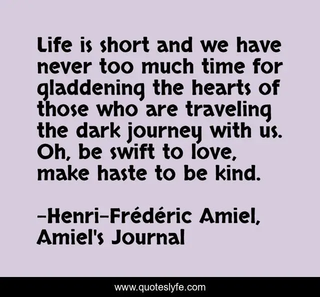This page presents the quote "Life is short and we have never too much time for gladdening the hearts of those who are traveling the dark journey with us. Oh, be swift to love, make haste to be kind.". Author of this quote is Henri-Frédéric Amiel, Amiel's Journal. This quote is about kindness, love, struggle, affection,.