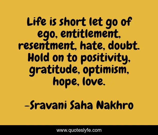 This page presents the quote "Life is short let go of ego, entitlement, resentment, hate, doubt. Hold on to positivity, gratitude, optimism, hope, love.". Author of this quote is Sravani Saha Nakhro. .
