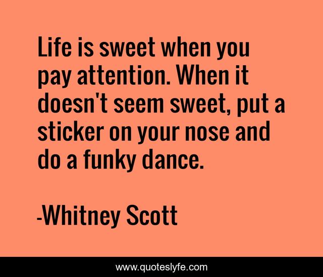 This page presents the quote "Life is sweet when you pay attention. When it doesn't seem sweet, put a sticker on your nose and do a funky dance.". Author of this quote is Whitney Scott. This quote is about dance, enthusiasm, life, inspirational,.