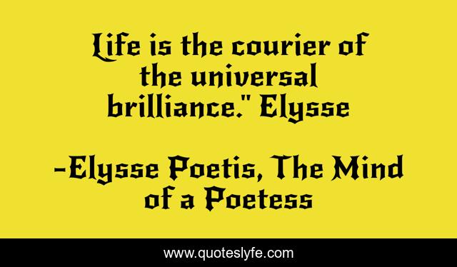 This page presents the quote "Life is the courier of the universal brilliance." Elysse". Author of this quote is Elysse Poetis, The Mind of a Poetess. This quote is about love, humour, poetry, fiction, drama, amazon-book, true-stories, inspirational, enthusiasm,.