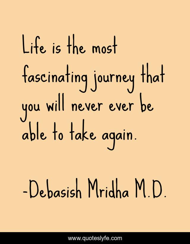 This page presents the quote "Life is the most fascinating journey that you will never ever be able to take again.". Author of this quote is Debasish Mridha M.D.. This quote is about life, life-is-a-journey, fascinating-journey, philosophy, debasish-mridha, quotes, inspirational, enthusiasm, debasish-mridha-m-d,.