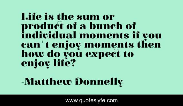 This page presents the quote "Life is the sum or product of a bunch of individual moments if you can't enjoy moments then how do you expect to enjoy life?". Author of this quote is Matthew Donnelly. This quote is about enjoy, moments, life, happiness,.