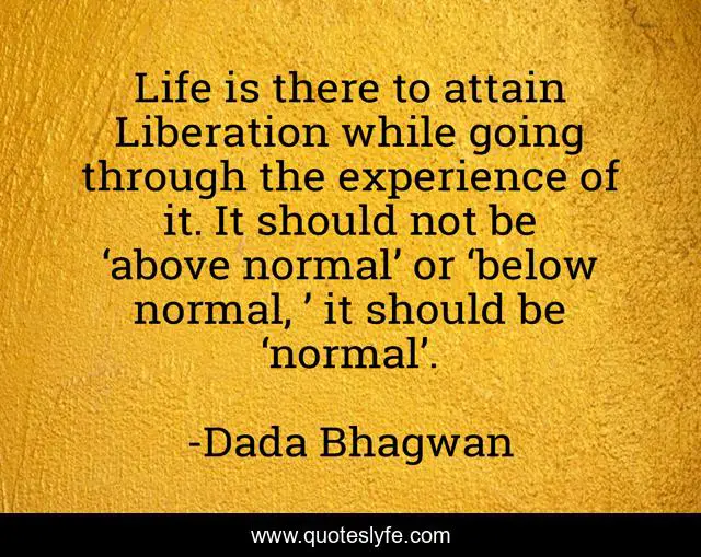 This page presents the quote "Life is there to attain Liberation while going through the experience of it. It should not be ‘above normal’ or ‘below normal, ’ it should be ‘normal’.". Author of this quote is Dada Bhagwan. This quote is about spiritual, moksha, liberation, self, self-realized, soul, knowledge-of-the-self, knowledge-of-self, self-realised,.