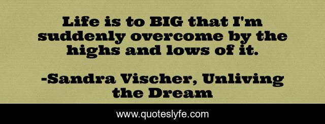 This page presents the quote "Life is to BIG that I'm suddenly overcome by the highs and lows of it.". Author of this quote is Sandra Vischer, Unliving the Dream. This quote is about enthusiasm, life, dream, inspirational,.