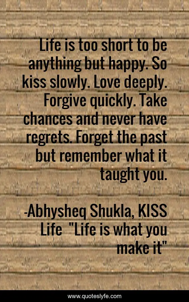 Life is too short to be anything but happy. So kiss slowly. Love deeply. Forgive quickly. Take chances and never have regrets. Forget the past but remember what it taught you.