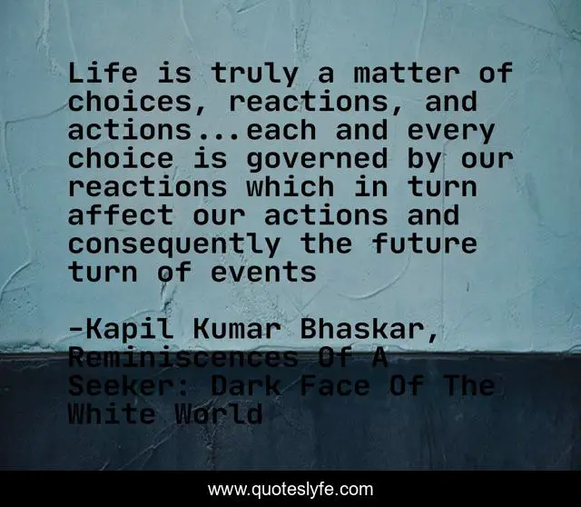 This page presents the quote "Life is truly a matter of choices, reactions, and actions...each and every choice is governed by our reactions which in turn affect our actions and consequently the future turn of events". Author of this quote is Kapil Kumar Bhaskar, Reminiscences Of A Seeker: Dark Face Of The White World. This quote is about life, spiritual, readers, paranormal, spirituality, book, nonfiction, memoir, thriller,.
