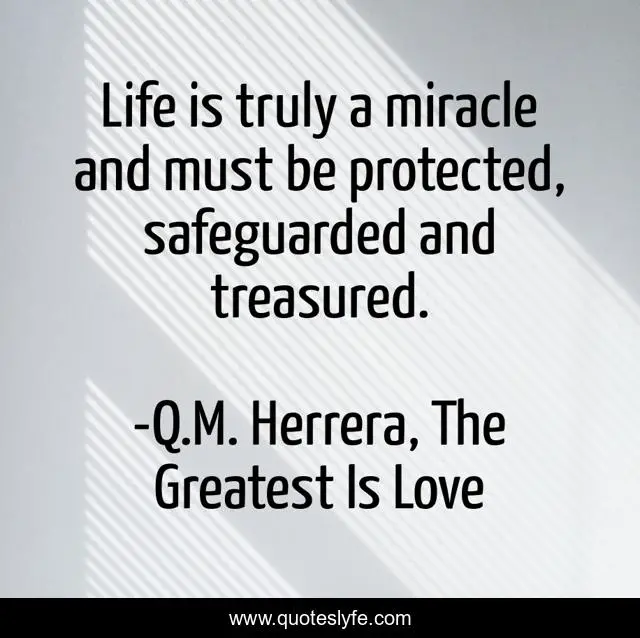 This page presents the quote "Life is truly a miracle and must be protected, safeguarded and treasured.". Author of this quote is Q.M. Herrera, The Greatest Is Love. This quote is about enthusiasm, life-and-living, inspirational, inspirational-religious, inspirational-living,.