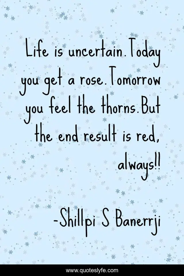 This page presents the quote "Life is uncertain.Today you get a rose.Tomorrow you feel the thorns.But the end result is red, always!!". Author of this quote is Shillpi S Banerrji. This quote is about life, best-inspirational, survival, indian-authors, feelings, roses, writers, followers, good-reads,.