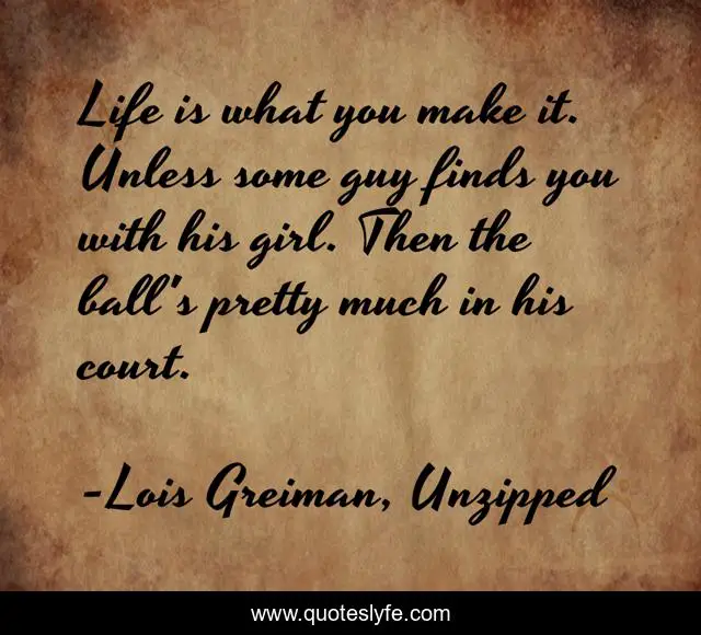 This page presents the quote "Life is what you make it. Unless some guy finds you with his girl. Then the ball's pretty much in his court.". Author of this quote is Lois Greiman, Unzipped. This quote is about mystery, funny, chick-lit, humourous, los-angeles, comedy, chicklit,.