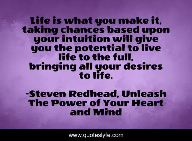This page presents the quote "Life is what you make it, taking chances based upon your intuition will give you the potential to live life to the full, bringing all your desires to life.". Author of this quote is Steven Redhead, Unleash The Power of Your Heart and Mind. This quote is about intuition, desires, chances, life, live, potential,.