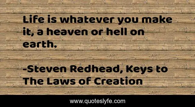 This page presents the quote "Life is whatever you make it, a heaven or hell on earth.". Author of this quote is Steven Redhead, Keys to The Laws of Creation. This quote is about earth, life, heaven, hell,.