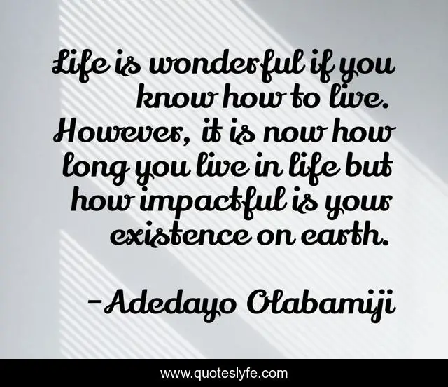 This page presents the quote "Life is wonderful if you know how to live. However, it is now how long you live in life but how impactful is your existence on earth.". Author of this quote is Adedayo Olabamiji. This quote is about life-philosophy, life, life-lessons,.
