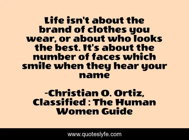 This page presents the quote "Life isn't about the brand of clothes you wear, or about who looks the best. It's about the number of faces which smile when they hear your name". Author of this quote is Christian O. Ortiz, Classified : The Human Women Guide. This quote is about life, name, brand, number, hear, looks, they, faces, smile,.