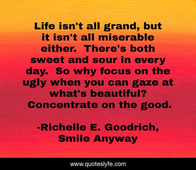 This page presents the quote "Life isn't all grand, but it isn't all miserable either. There's both sweet and sour in every day. So why focus on the ugly when you can gaze at what's beautiful? Concentrate on the good.". Author of this quote is Richelle E. Goodrich, Smile Anyway. This quote is about life, goodness, beauty, richelle, happiness, inspirational, richelle-goodrich, enthusiasm, hope,.