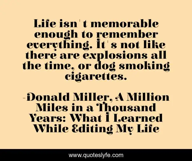 This page presents the quote "Life isn't memorable enough to remember everything. It's not like there are explosions all the time, or dog smoking cigarettes.". Author of this quote is Donald Miller, A Million Miles in a Thousand Years: What I Learned While Editing My Life. This quote is about consciousness, contemplation, reflection, selective-memory,.