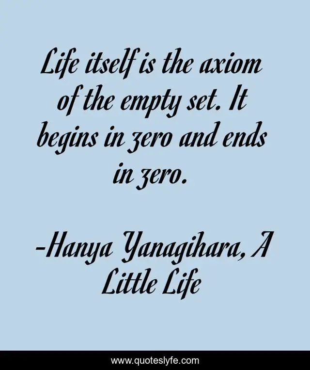 This page presents the quote "Life itself is the axiom of the empty set. It begins in zero and ends in zero.". Author of this quote is Hanya Yanagihara, A Little Life. This quote is about life, nothingness, mortality,.
