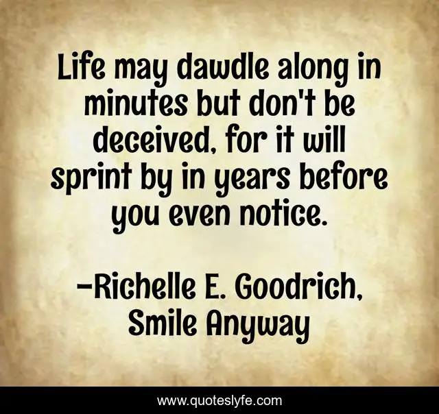 This page presents the quote "Life may dawdle along in minutes but don't be deceived, for it will sprint by in years before you even notice.". Author of this quote is Richelle E. Goodrich, Smile Anyway. This quote is about life, years, passing-days, richelle, time, richelle-goodrich, passing-of-time,.